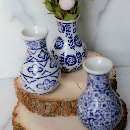 3" Round x 4-3/4"H Hand-Stamped Stoneware Vase w/ Pattern, Blue & White, 3 Styles