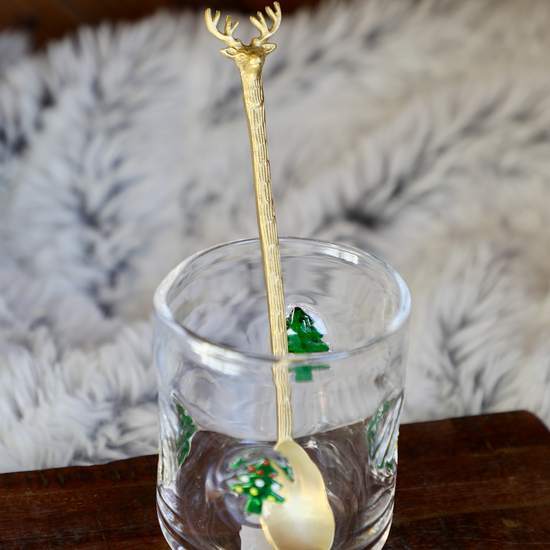 This brass cocktail spoon features a reindeer handle that adds a festive sparkle to the drinkware. The handle has a gold finish that matches well with any glassware or barware. The spoon has a long and slender shape that makes it ideal for stirring, mixing, or garnishing cocktails, mocktails, or hot beverages. The spoon comes in a printed drawstring bag, which makes it easy to store and gift. The spoon is made of metal, which is durable, shiny, and easy to clean. It measures 8.25 inches in length and 1.25 inches in width. This reindeer-handled brass cocktail spoon will bring style and convenience to any drink. A brass cocktail spoon with a reindeer handle that adds a festive sparkle to the drinkware. Perfect for stirring, mixing, or garnishing cocktails, mocktails, or hot beverages. The spoon comes in a printed drawstring bag that makes it easy to store and gift.
