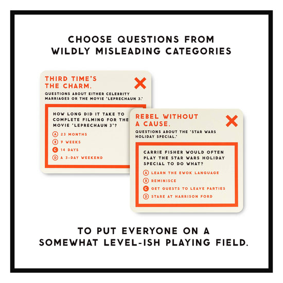 Each question is grouped in an entertainingly-misleading category to keep everyone guessing – literally.