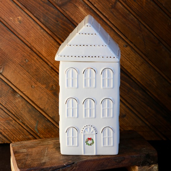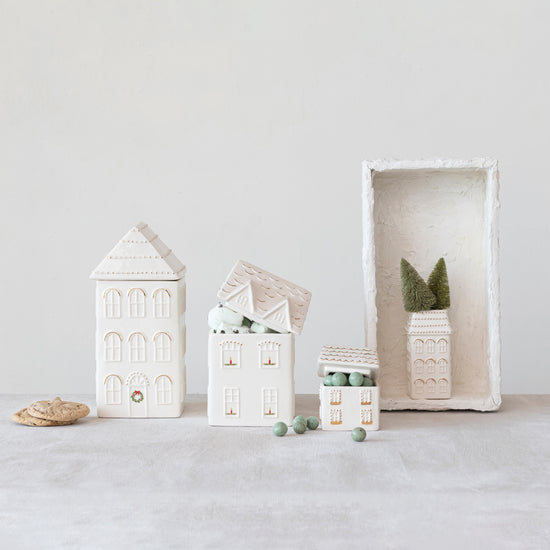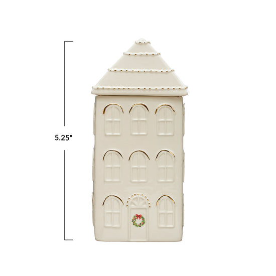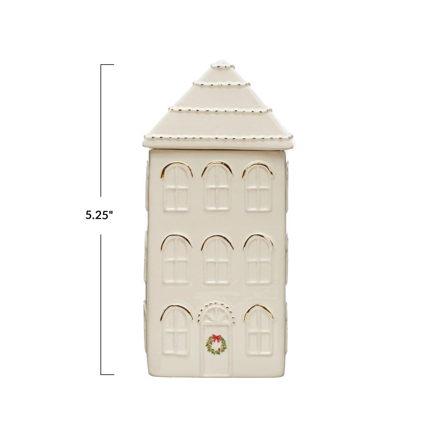 This 5.25" Square x 11"H house-shaped cookie jar is hand-painted stoneware perfection with its gold electroplating and classic Christmas village style - totally giving a clean look!
