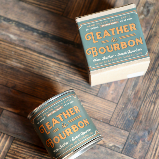 Perfect gifting candles! Made with 100% all-natural, clean-burning soy wax and fragrance oils in half pint tin with lid and cotton wick. 8 oz Soy Candle with Cotton Wick Approximate 40 Hour Burn Half Pint Tin 3 inches x 2.75 inches Scent: Fine Leather + Sweet Bourbon