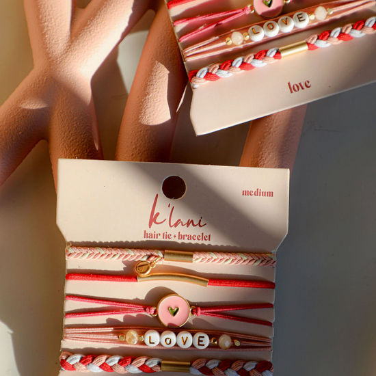 Our Love set is a fun mix of pinks and reds. Each set includes 5 hair tie bracelets. A heart charm adds a sweet, playful touch to any look. The perfect gift for your special someone.
