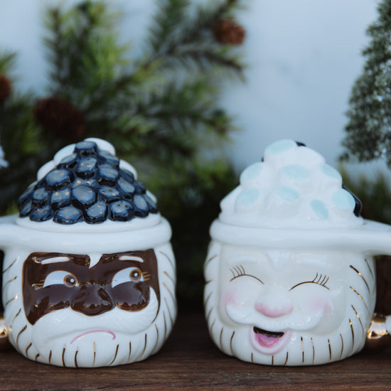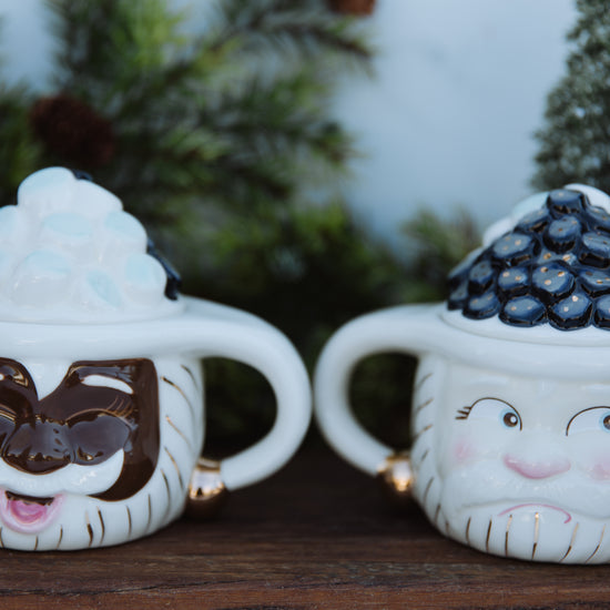 Impress your friends and family with this special Papa Noel Naughty & Nice mug! Stunning 6.5" ceramic mug glazed with hand-painted festive colors and real gold accents will have everyone wondering how you got so fancy. Each side of the mug features a unique design - one naughty and one nice - and the matching cap is made of festive marshmallows on one side and coal on the other!