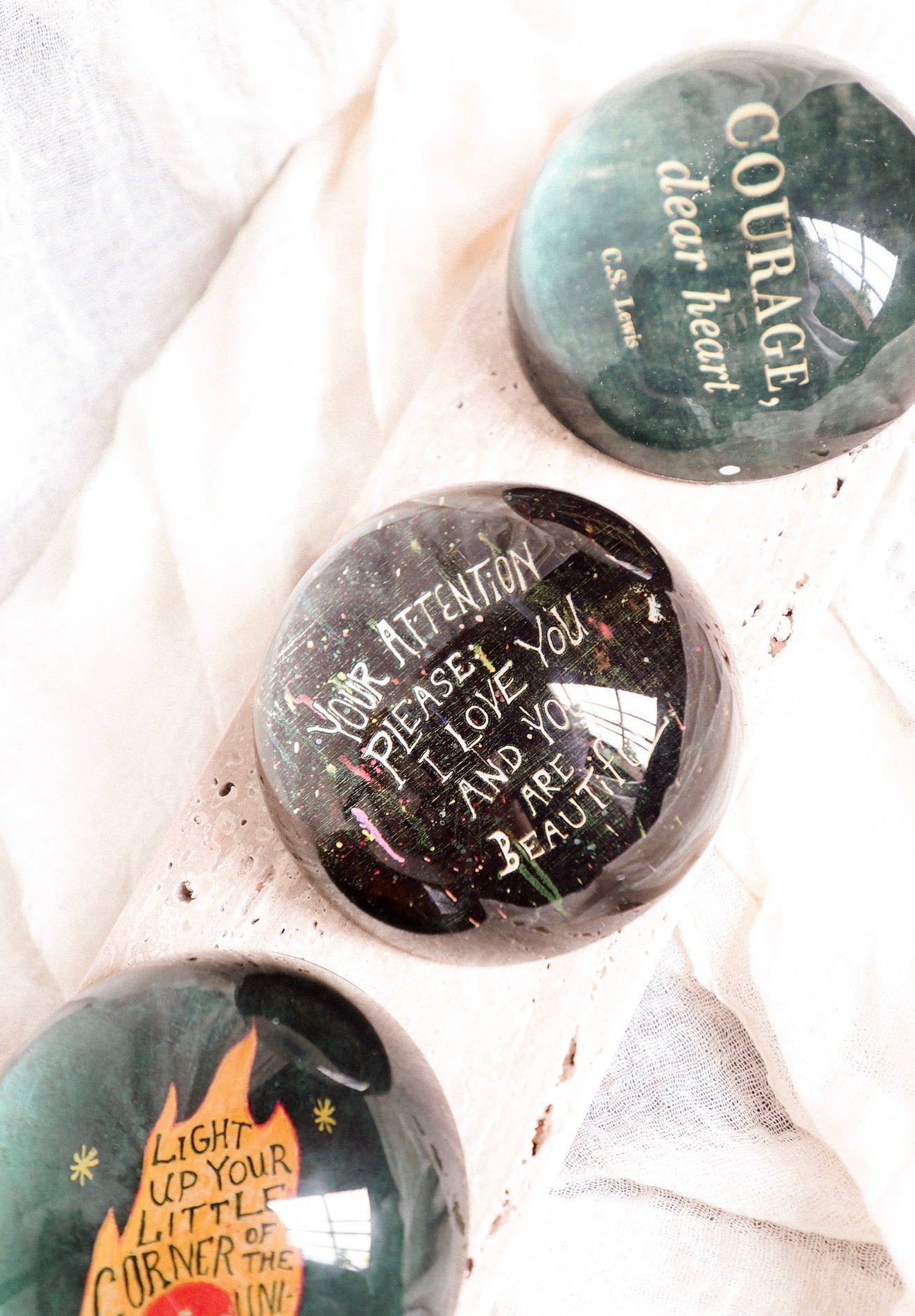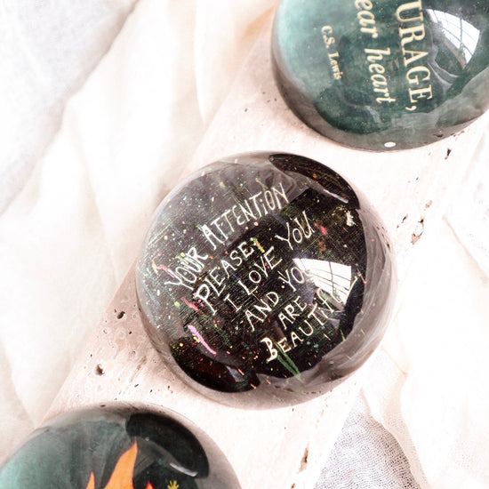 A charming 4" x 4" round paperweight designed to brighten your desk or shelf. Each piece features an uplifting message that serves as a daily reminder of encouragement and positivity. Perfect for gifting to colleagues, friends, or yourself—a thoughtful way to add inspiration to any workspace or home.