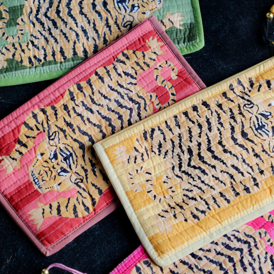 9-1/2"L x 5-1/2"H Cotton Voile Printed Zip Pouch w/ Tibetan Tiger, Stripes, Tassel & Interior Coating, 4 Colors